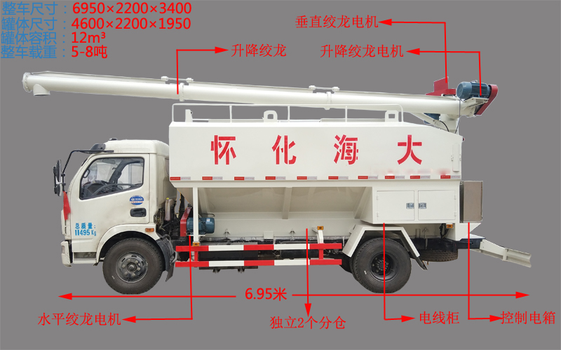 (4)料罐容積:12-14方或者17方,2個獨立倉,實載:豬料9噸,雞料10噸