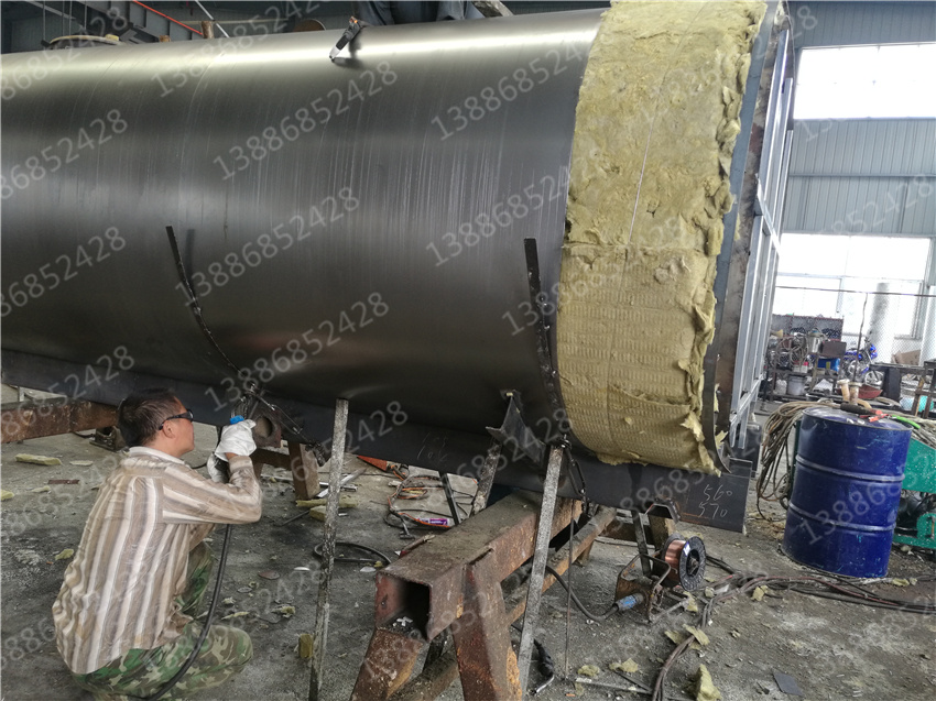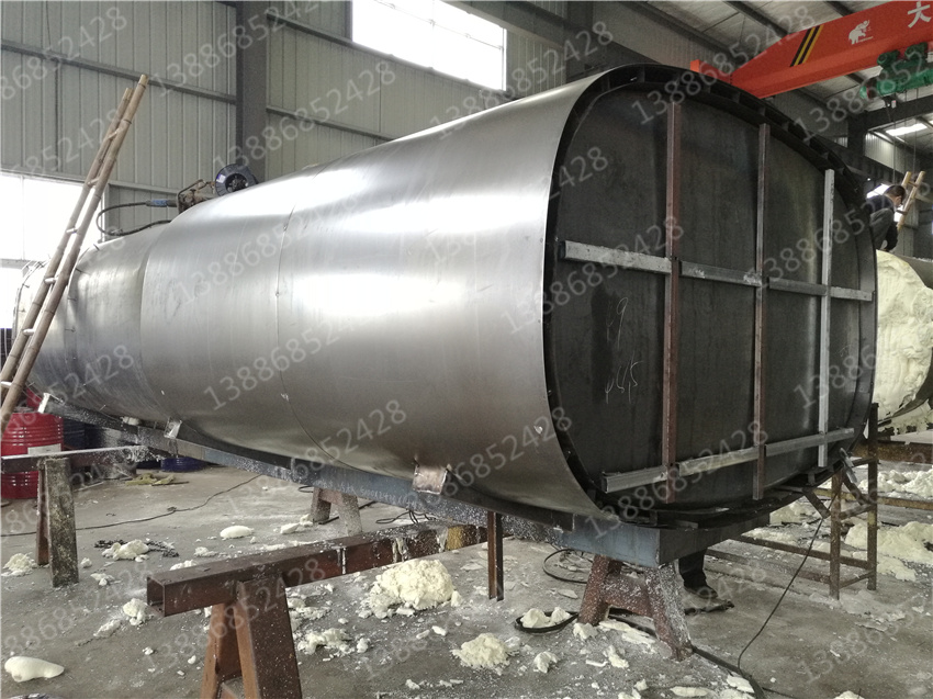另一種則是聚氨脂材料發(fā)泡保溫。聚氨脂泡沫材料的填充是利用專門的發(fā)泡機械將化學生成的發(fā)泡體噴吐至罐體與骨架之間。噴吐時慢慢的堆積成型,這樣使泡沫材料更加嚴實。對于多余的或高于骨架外型表面的發(fā)泡體,利用鏟刀將其打磨。外表蒙上一層0.8mm厚的冷軋板,采用抽芯鉚釘將冷軋板固定在骨架上。