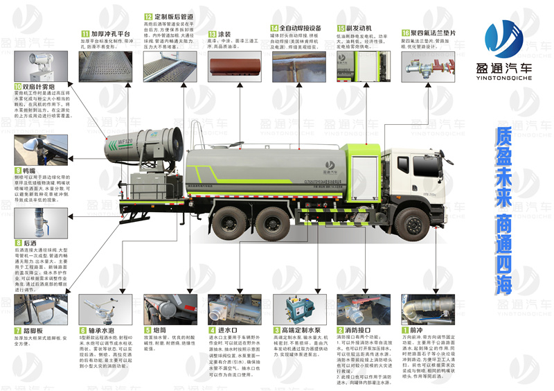 華神120米霧炮車_華神T5多功能抑塵車_華神17方120米霧炮車_湖北盈通專用汽車有限公司,該車用途為城鄉(xiāng)道路和鐵路礦場的抑塵降霾,主要裝置為罐體及噴霧裝置.罐體總?cè)萘?/span>:14.05立方米,罐體有效容積:13.38立方米,罐體外形尺寸(長×長軸×短軸)(mm):5000×2400×1700;側(cè)、后防護(hù)材料均為:Q235碳鋼,連接方式均為:螺栓連接,后部防護(hù)截面尺寸(mm):120×50,后部防護(hù)離地高度(mm):480.ABS型號/生產(chǎn)廠家:3631010-C2000/東科克諾爾商用車制動(dòng)系統(tǒng)(十堰)有限公司,J ABS/焦作博瑞克控制技術(shù)有限公司.選裝霧炮樣式.整車長度/前懸/后懸/后伸對應(yīng)關(guān)系(mm):11470/1410(1500,1250)/3430(3340,3490)/930(930,1030),10540/1410(1500)/3430(3340)/無后伸,10440/1250/3490/無后伸.僅采用底盤4350+1350軸距(mm)改裝.后部作業(yè)燈僅在作業(yè)時(shí)開啟,車輛行駛過程中不可開啟。 |