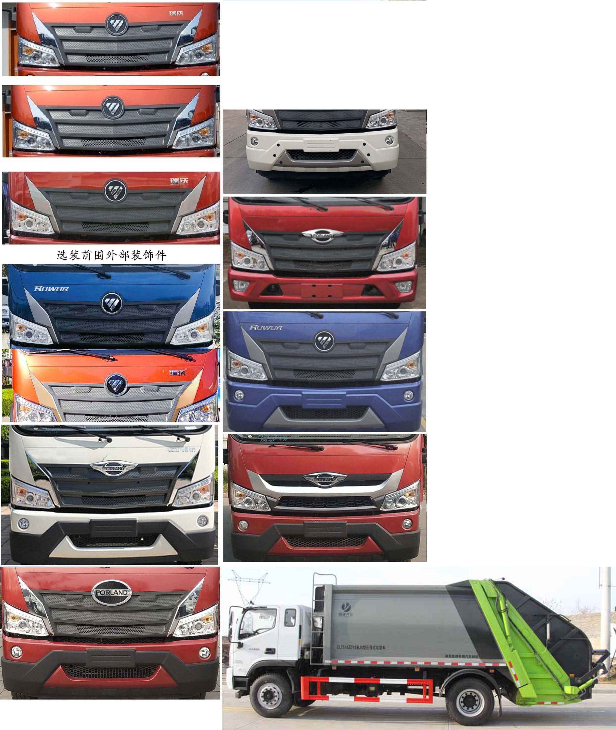 福田壓縮垃圾車,壓縮對接式垃圾車,領航壓縮垃圾車,壓縮垃圾站,該車主要專用裝置由箱體、壓縮系統組成,用于垃圾的收集與清運;隨底盤選裝新風格格柵.選裝新前格柵及新logo.選裝新款前格柵,新款保險杠,新造型前霧燈;選裝側部及后部結構;安裝無翻轉機構時無后伸,選裝翻桶裝置,翻斗裝置時,后伸380mm,選裝密封斗,擺臂裝置時,后伸280mm;整車長(mm)/軸距(mm)/前懸(mm)/后懸(mm)/后伸(mm)對應關系為:8860/4500/1260(1240)/2720(2740)/380,8760/4500/1260(1240)/2720(2740)/280,8480/4500/1260(1240)/2720(2740)/0,8100/3950/1260(1240)/2510(2530)/380,8000/3950/1260(1240)/2510(2530)/280,7720/3950/1260(1240)/2510(2530)/0;側防護裝置,材料:Q235碳鋼,連接方式:螺栓連接;后部防護為專用裝置代替,后部防護離地高度(mm):440;ABS型號為CM4XL-4S/4M,生產廠家為廣州瑞立科密汽車電子股份有限公司;安裝具有衛星定位功能的行駛記錄儀;發動機型號/油耗申報值(L/100km)對應關系為:WP4.1NQ190E61/25.89,F4.5NS6B190/26.28,YCS04200-68/25.88;選裝直接供電式ETC車載裝置.采用4500mm,3950mm軸距的底盤改裝.隨底盤選裝限速裝置,限速88km/h.