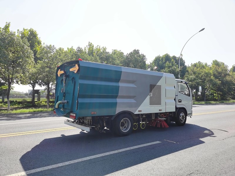該洗掃車(chē)采用東風(fēng)多利卡國(guó)六二類(lèi)底盤(pán)改裝,加裝副發(fā)動(dòng)機(jī)、風(fēng)機(jī)、清水箱、垃圾箱、左右立掃、掃盤(pán)降塵系統(tǒng)、左右高壓側(cè)噴高、吸盤(pán)內(nèi)置高壓主噴桿、氣動(dòng)系統(tǒng)、液壓系統(tǒng)、專(zhuān)用裝置電控系統(tǒng)和副車(chē)架等改裝而成。