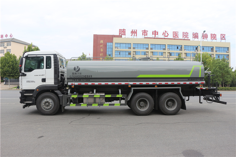 重汽汕德卡灑水車_汕德卡后雙橋灑水車_重汽曼310灑水車_湖北盈通專用汽車有限公司,ABS型號:4460046300;ABS生產企業:威伯科(上海)管理有限公司;選裝描述:隨底盤選裝駕駛室,選裝EBS,EBS系統控制器生產企業/型號為威伯科(上海)管理有限公司/EBS3;側后防護情況:側、后防護材料均為Q235碳鋼,連接方式:螺栓連接,后部防護截面尺寸(mm):120×50,后部防護離地高度(mm):480;罐體有效容積(立方米)、罐體外形尺寸(mm):罐體有效容積:14.7立方米;罐體外形尺寸(×長軸×短軸)(mm):6500×2360×1400;專用功能及裝置:該車主要用于城鄉園林綠化,路面噴灑,除塵和降溫;主要裝置為水罐及噴灑裝置;