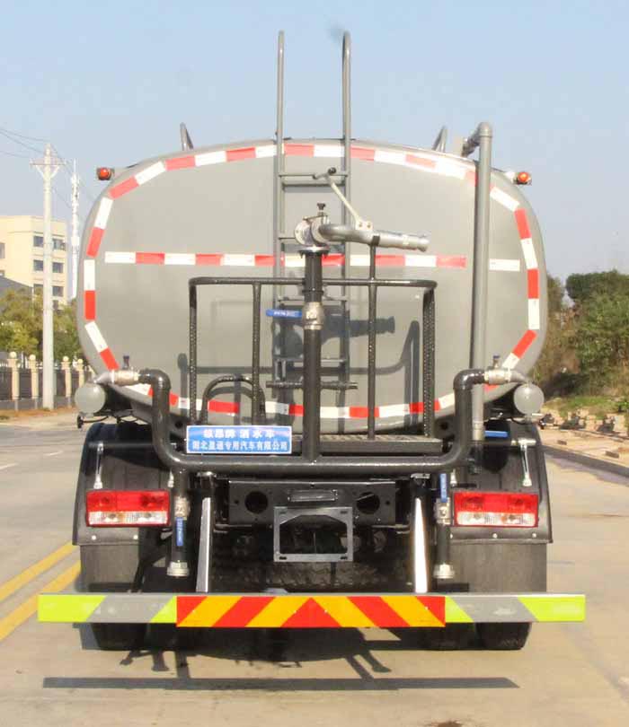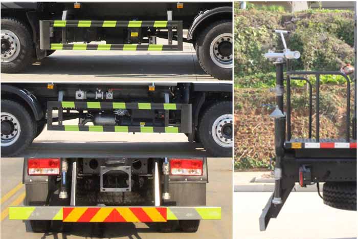 該車主要用于城鄉園林綠化噴灑作業;主要裝置為水罐及噴灑裝置;罐體總容量:11.66立方米;罐體有效容積:11.1立方米;罐體外形尺寸(×長軸×短軸)(mm):4200×2300×1450.運輸介質:,密度1000千克/立方米;ABS型號為CM4XL-4S/4M,生產廠家為廣州瑞立科密汽車電子股份有限公司.側、后防護材料均為:Q235碳鋼,連接方式均為:螺栓連接;后部防護截面尺寸(mm):120×50,后部防護離地高度(mm):480.隨底盤選裝限速裝置,限速88km/h.選裝前部電子水炮裝置樣式,選裝前部不帶電子水炮;當前部帶電子水炮時,前伸500mm,整車長度為8250mm,8000mm;當前部不帶電子水炮時,前伸為0mm,整車長度為7750mm,7500mm.僅采用底盤3950mm軸距改裝.隨底盤選裝新款前格柵,新款保險杠,新造型前霧燈.選裝油箱電瓶安裝位置,選裝車輛前部鴨嘴裝置.