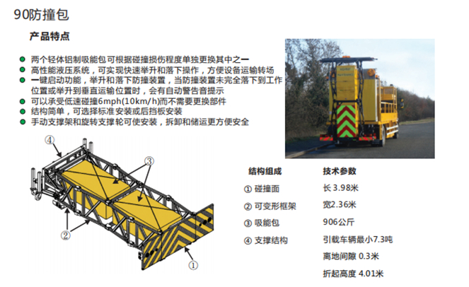 3、緩沖防撞車可廣泛地應用于高速公路、國省道、城市快速路、大型橋梁和隧道。可以有效提升道路交通的安全防護水平。