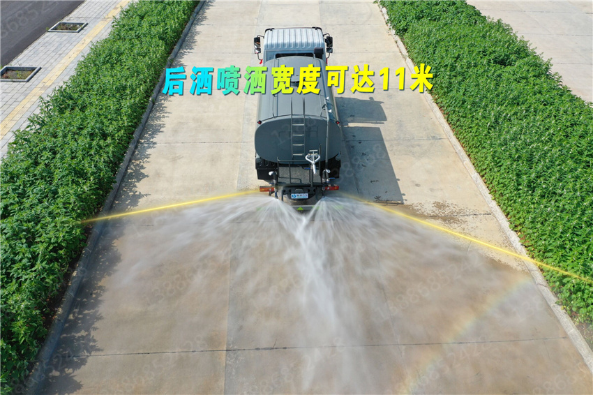 東風(fēng)華神10方抑塵車專用功能配置:罐體有效容積9噸,采用武鋼4mm 優(yōu)質(zhì)碳鋼一次卷壓無(wú)縫成型,專用部分配專用灑水泵,帶前沖、后灑、側(cè)噴、后工作平臺(tái)及灑水高壓炮。配消防接口、自流閥,2根與罐體等長(zhǎng)輸水管,水位計(jì),1個(gè)爬梯,兩側(cè)及后杠。灑水泵自吸高度為7米,出水量為60立方米每小時(shí),灑水寬度大于14米,后工作平臺(tái)水炮可調(diào)成直沖狀、大雨、中雨、小雨、毛毛雨,直沖射程25米左右,霧狀射程15米左右。(可選配:錳鋼罐體、加粗管道、駕駛室一鍵操作、氣動(dòng)控制、罐體防腐、高端灑水泵)